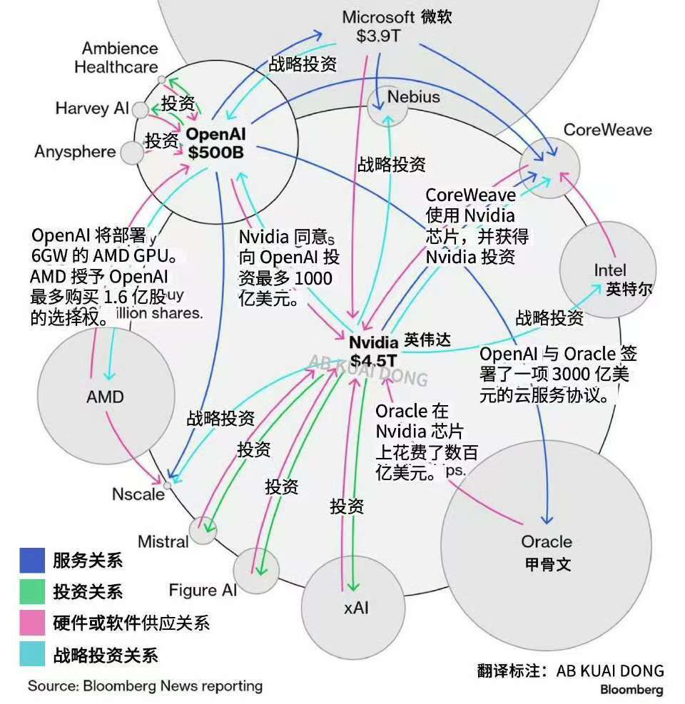 目前全球科技與AI為未來競爭核心,從附圖所示,以OpenAI為中心,一眾美國科技巨頭如Nvidia、AMD、Microsoft、Oracle等互相持股與合作,形成高效「資本循環體」,彭博指這種「環狀投資」為AI產業鏈自我「製造血液」,成為推動美股估值上升的關鍵引擎,進而演化為科技生態的「造錢機器」 ; 除稀土管制嚴重影響美國產業外,倘若估值泡沫化或晶片供應鏈受阻,風險亦可能迅速擴大,若特朗普以稅務優惠及放鬆監管等配合此模式,美國有機會鞏固全球科技領導地位,冀望進一步領先中國。